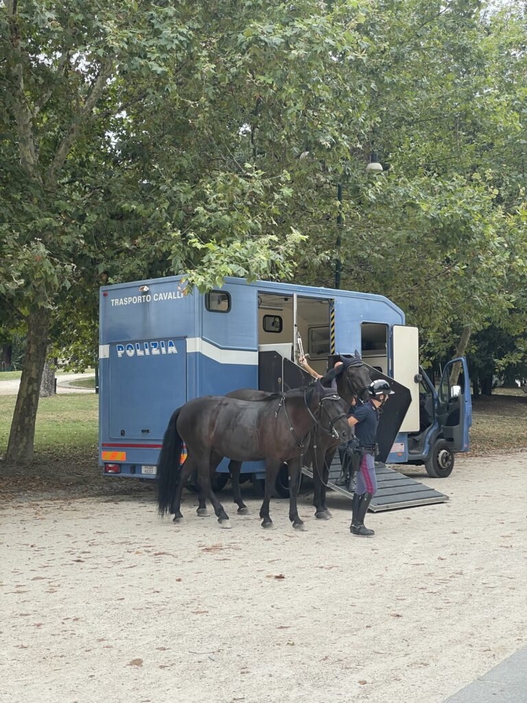 Pokračovali jsem kolem milánské pevnosti, kde jsme potkali místní policii, která přijela s karavanem trénovat hlídkování na koních.