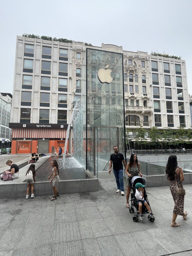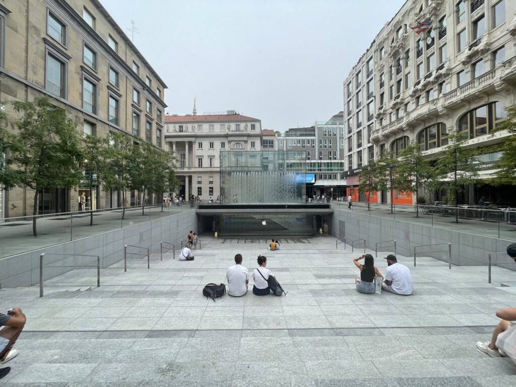 Pak jsme došli k pobočce Applu, která byla navržena architektem Normanem Fosterem, který dělal mimo jiné Apple park v San Francisku nebo významné mrakodrapy po celém světě. Jedná se o obchod umístěný pod náměstím s velice unikátním vstupem.