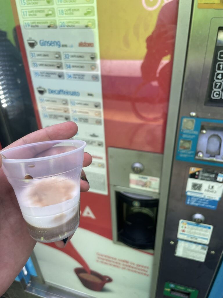 Cestou po nástupišti jsme potkali místní automat, který dělá kávu z čerstvě namletých zrn. Už jsme ho ve městě potkali několikrát, ale tentokrát jsem už neodolal (Julča zrovna kávová není, takže jen já). Zvolil jsem espresso macchiato (do češtiny skvrnitá káva) a bylo velice dobré (teda po většinu času, nedošlo mi, že se na automatu nastavuje cukr a ke konci, kdy se začal rozpouštět, už to nebylo úplně ono)