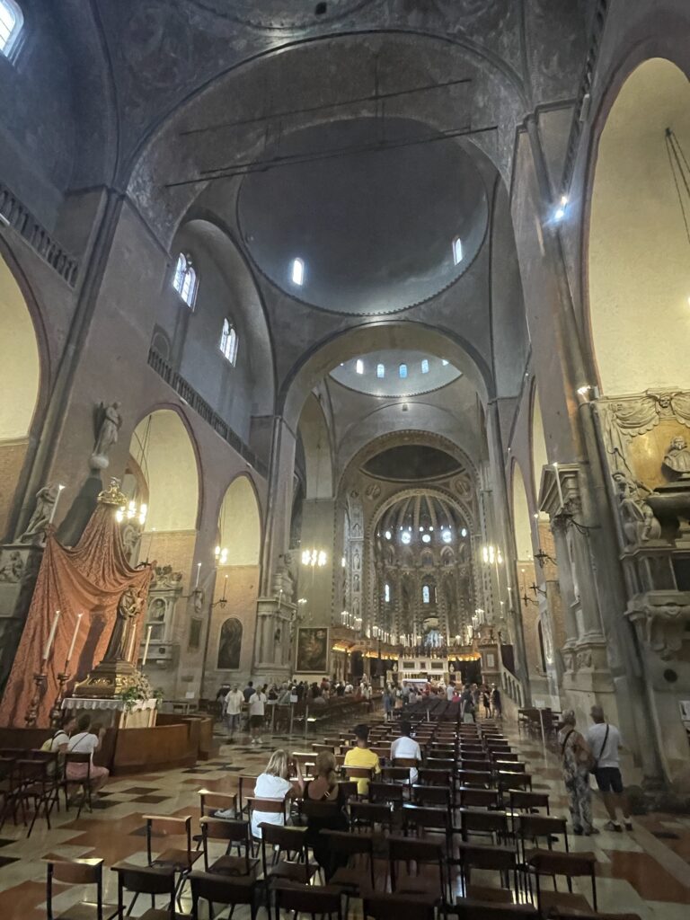 Pokračovali jsme na náměstí Prato della Valle, které je jedním z největších náměstí v Evropě a přibližně 10x větší než Staroměstské. Dál nás naše průvodkyně zavedla k bazilice svatého Antonína a kolem kontroly délky kalhot a zakrytých ramen jsme se protáhli do interiéru. Sice jsme z Milána zvyklí na jiné dimenze, ale i tak se dalo v kostele na něco dívat.