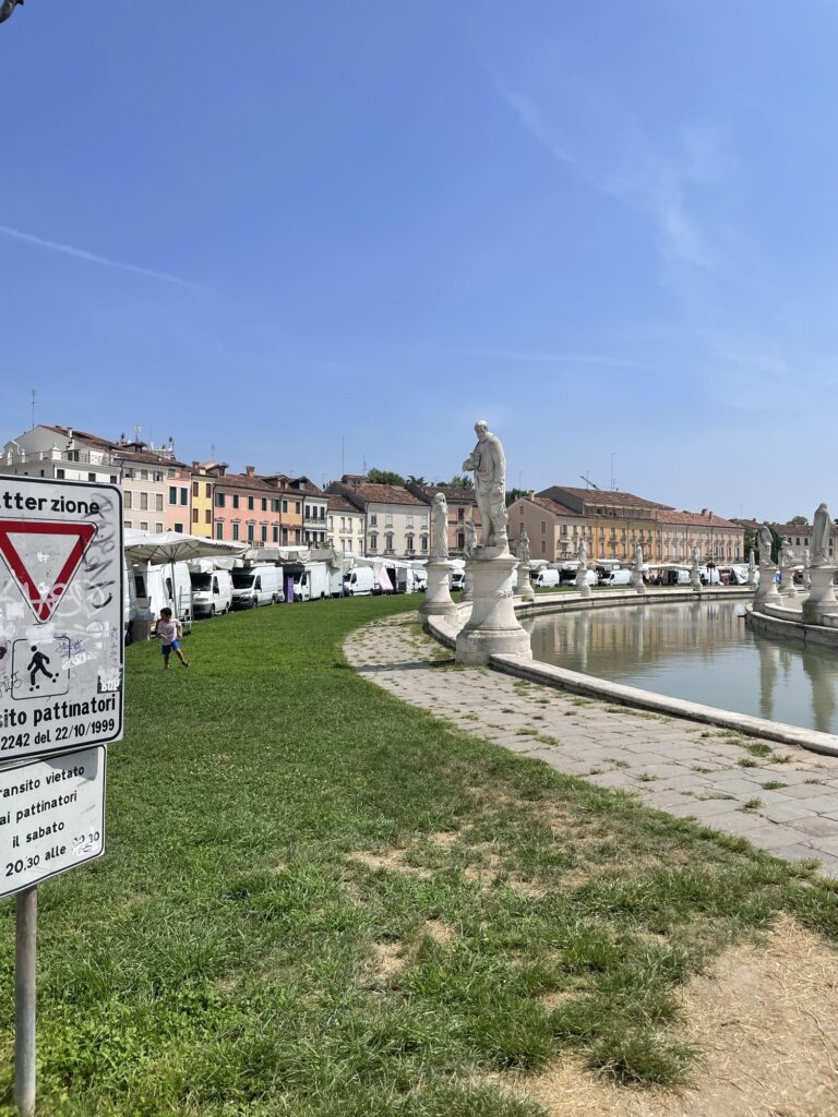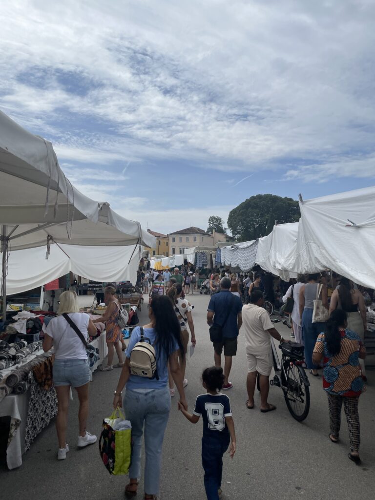 Pak už jsme si vyrazili koupit špagety do ruky a šli si je sníst do parku na už zmiňovaném náměstí. Tam se dnes konaly sobotní trhy a desítky dodávek a nákladních aut byly rozesety po celém jeho obvodu.