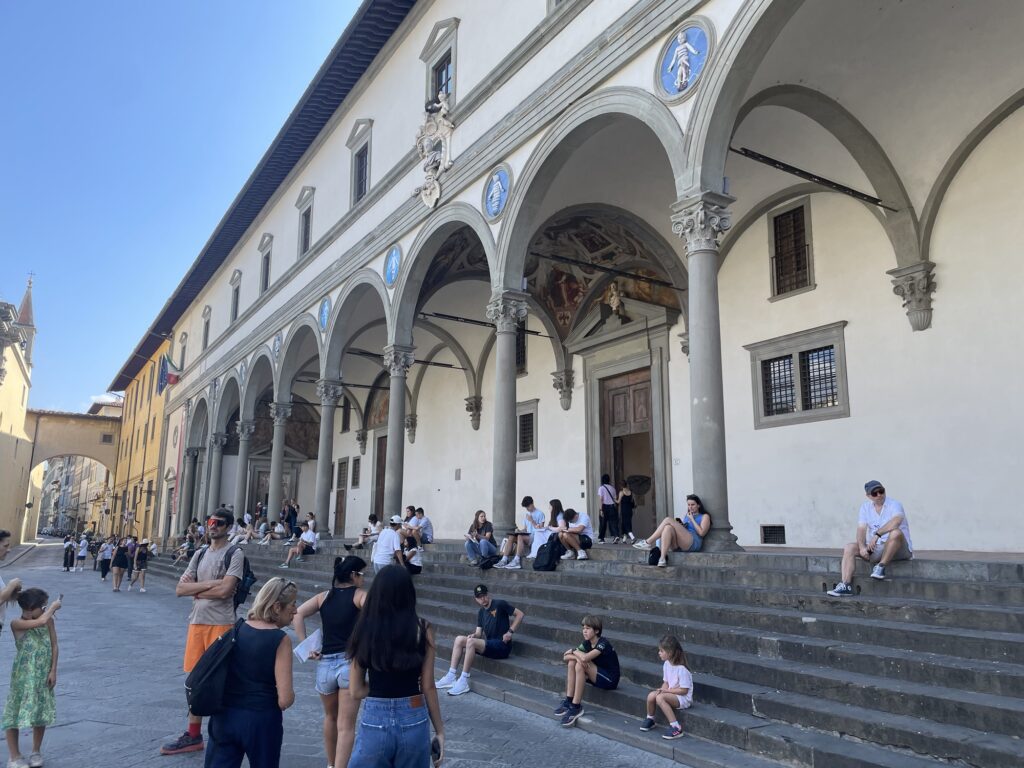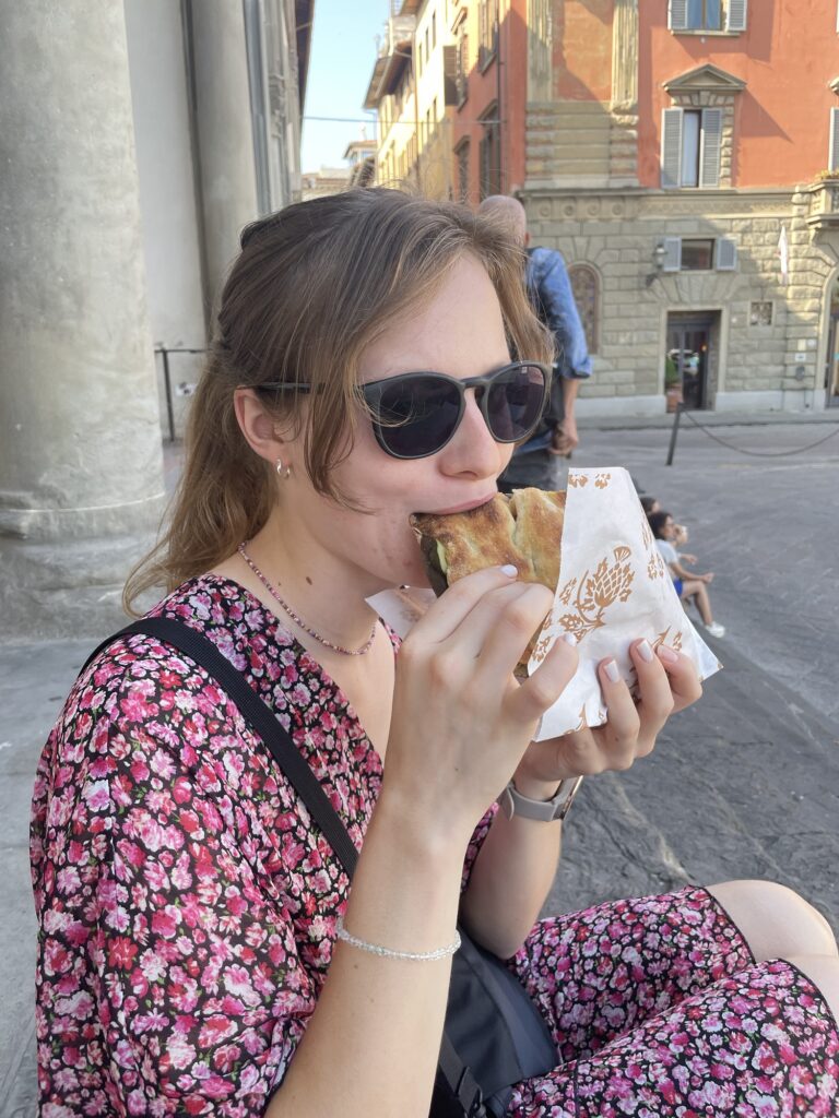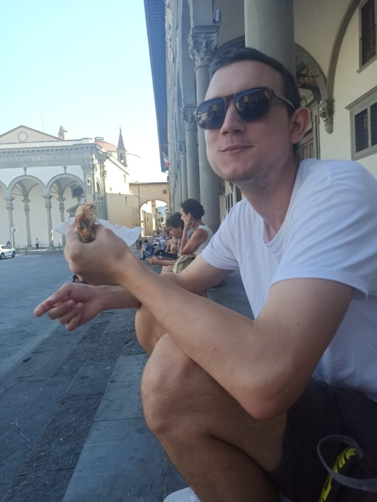Po Davidovi jsme se vypravili něco zakousnout. Jelikož jsme vybíraví, tak to chvíli trvalo, ale vybrali jsme jeden místní podnik a dali „italský sendvič“. Byli to dvě placky z těsta a mezi nimi bohatá náplň, ještě nám to paní doohřála a šli jsme si to sníst na schody před první renesanční stavbu.