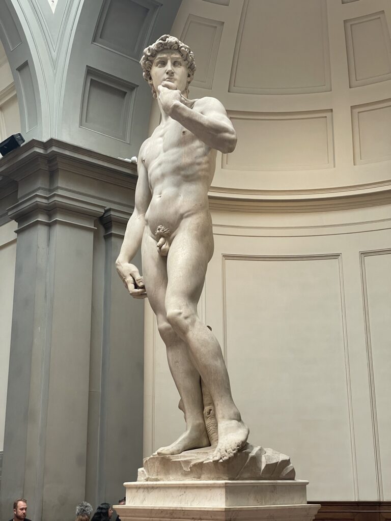 Naše ráno začalo návštěvou nejznámějšího místního díla – sochy Davida. Florentinští umělci tvořili sochu na katedrálu a byl jim nabídnut šesti tunový blok mramoru, který ale odmítli pro jeho nedokonalosti. Nakonec se však práce ujal mladý Michelangelo, tehdy pouhých 26 let starý, ale již uznávaný a dobře placený umělec. Michelangelo na Davidovi pracoval více než dva roky. Podle legendy sochal dokonce i za deště, celý promočený, a spát chodil v oblečení a botách.