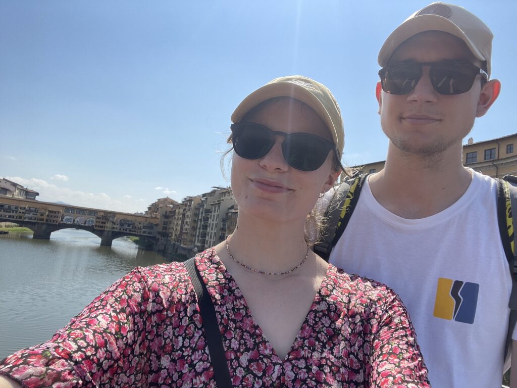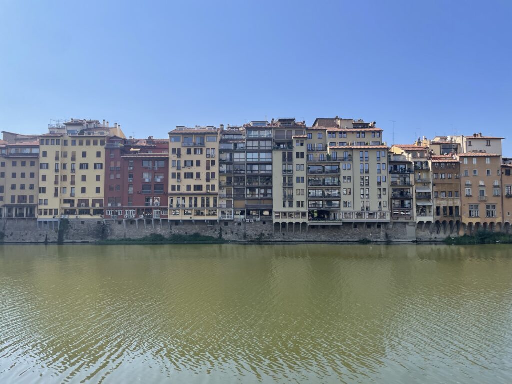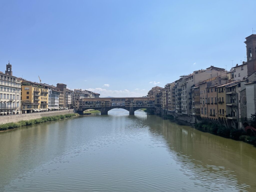 V tu chvíli už jsme prahli po trochu zchlazení a u řeky by nám mohlo být lépe. Proto jsme se vydali hledat most Ponte Vecchio. Ponte Vecchio neboli starý most či most zlatníků, jak se mu přezdívá, byl postaven v roce 1345 a nejdříve byl sídlem rybářů, řezníků a koželuhů. Ti byli ale v 16. století vyhnáni a nahrazení šperkaři a zlatníky možná i kvůli tomu, jak odpadem ze svých dílen znečišťování řeku. Dál se o podobu mostu zasloužila tzv. Vasariova chodba, která zde byla vystavěna na příkaz jednoho z Medicejských, aby měl bezpečný přesun z paláce na jedné straně řeky do druhého.