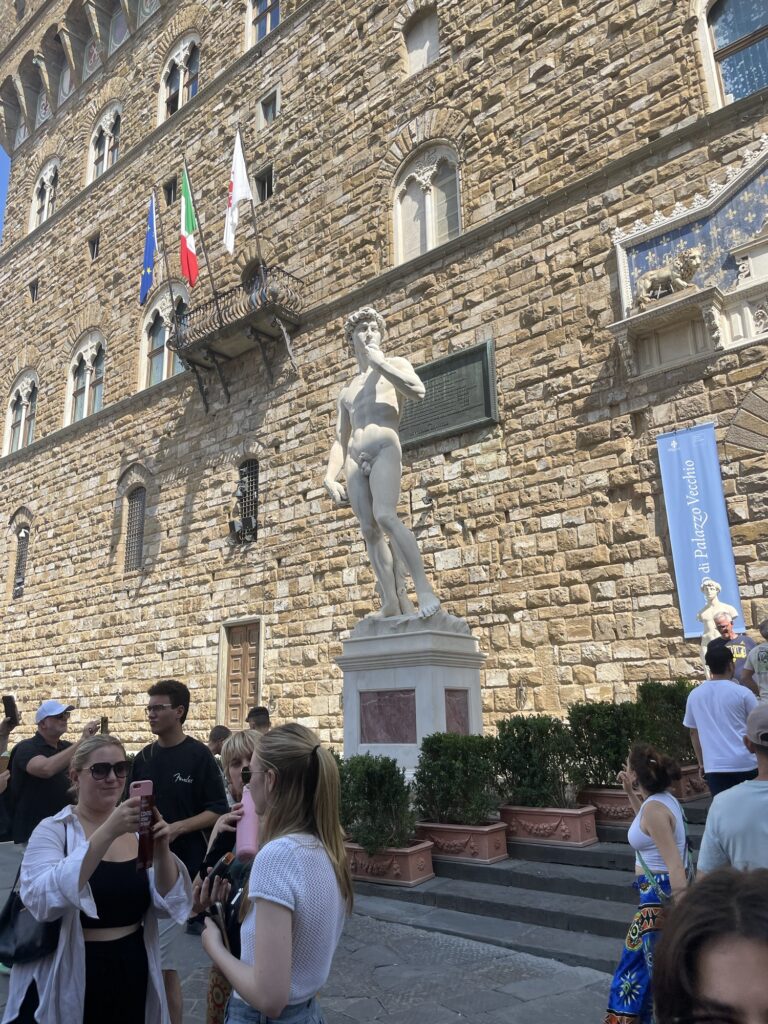 Naše další kroky směřovaly podél vody do galerie Uffizi na Zrození Venuše, ale sáhodlouhá fronta nás odradila a šli jsme se podívat na repliku Michelangelova Davida, co stojí na jeho původním místě na Piazza della Signoria.