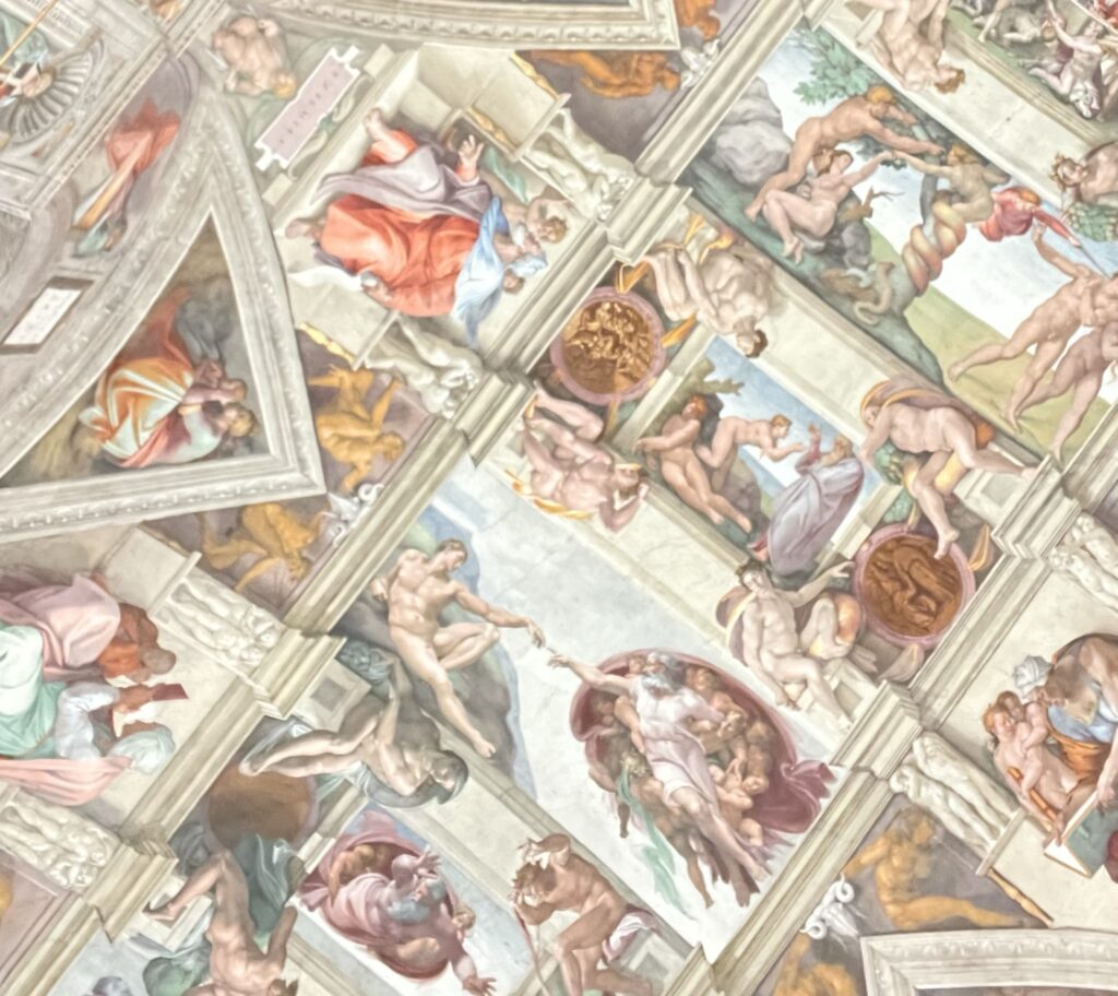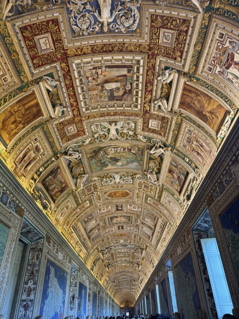 Naším jediným cílem bylo se dostat do Sixtinské kaple. Na internetech radili, že sice musí člověk projít částí muzea, ale že všude jsou cedule přímo na kapli. To byla pravda, jenomže cesta k ní vedoucí nás protáhla přes veškeré místnosti muzea a nebyla alternativa. Takže jsme po dlouhém bloumání mezi skupinami turistů přes přezdobené síně dorazili do Sixtinské kaple.