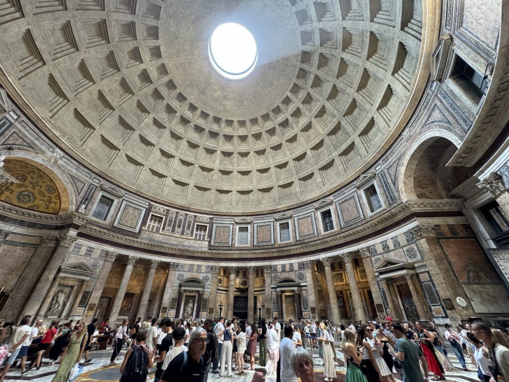 Pantheon jsme taky objevili a rychle se do něj i dostali. Byla to jedna ze staveb, co nás zachvátila svými rozměry. Pantheon je stavba založená v první století, její momentální podoba je výsledkem úprav dokončených v roce 123. Nejdříve byl chrámem všech bohů, ale v roce 609 byl zasvěcen Panně Marii a mučedníkům. Chrám je tvoře kruhovou aulou o průměru a výšce 43,22 metrů, zakončena je polokulovitou kupolí a okolusem (otvor na vrcholu) o průměru devíti metrů. Kupole je prý první stavbou s použitím litého pucolánového betonu a i přes odlehčování různými způsoby váží 4 500 tun. Podporují ji tedy stěny tlusté 6,4 metru.